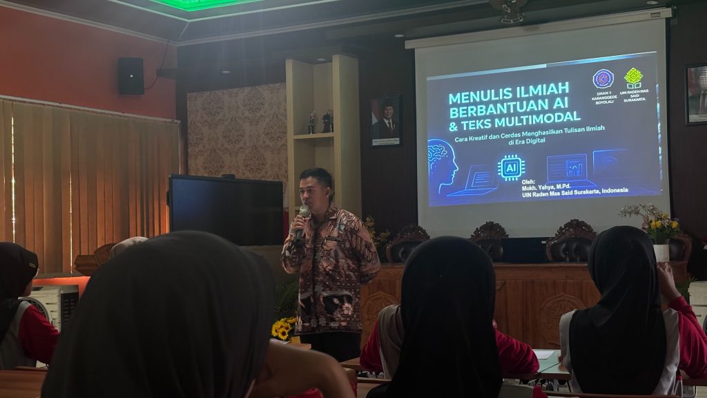 Workshop ini diselenggarakan sebagai upaya meningkatkan kompetensi peserta dalam menghasilkan karya ilmiah yang relevan dengan perkembangan teknologi, khususnya pemanfaatan kecerdasan buatan (Artificial Intelligence) dan integrasi teks multimoda. Kegiatan ini dilaksanakan pada tanggal 08 Desember 2025 dengan narasumber diikuti oleh perwakilan kelas dengan tujuan memperkuat kemampuan menulis, menganalisis, serta mempresentasikan informasi secara kreatif, efektif, sesuai kaidah ilmiah dan dapat membagikan ilmunya kepada teman-teman.